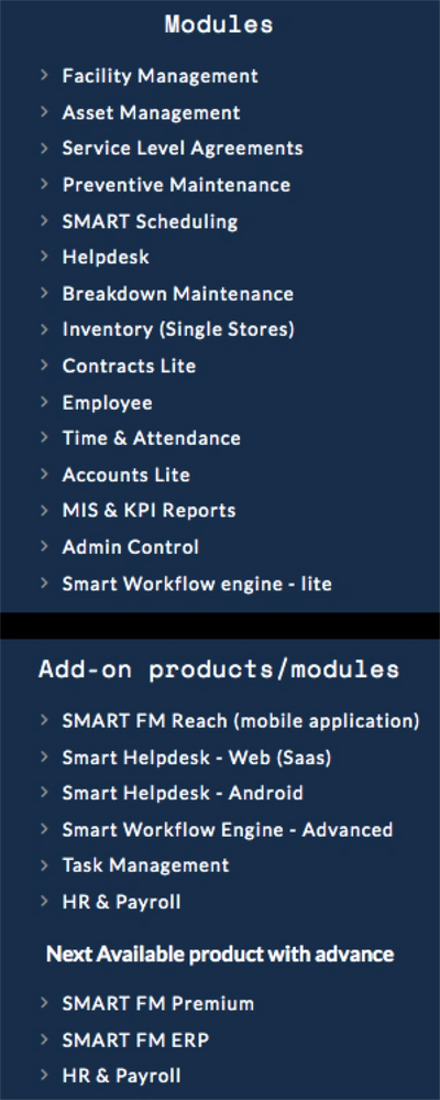 With SMART FM Lite, you will have the functionality necessary to manage your facilities, assets, checklists, preventive maintenance schedules, helpdesk, breakdown maintenance inventory, accounts, workforce, reports and admin controls.